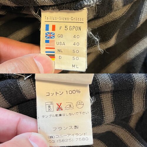 そして襟のリブはバインダーネックで屈強な作りで緩めの設計なので、インナーに着たTシャツをチラッと見せられます。襟タグは残っているものの印字がほとんど消えてしまっているので、どこのブランドなのか判別できませんでした💦