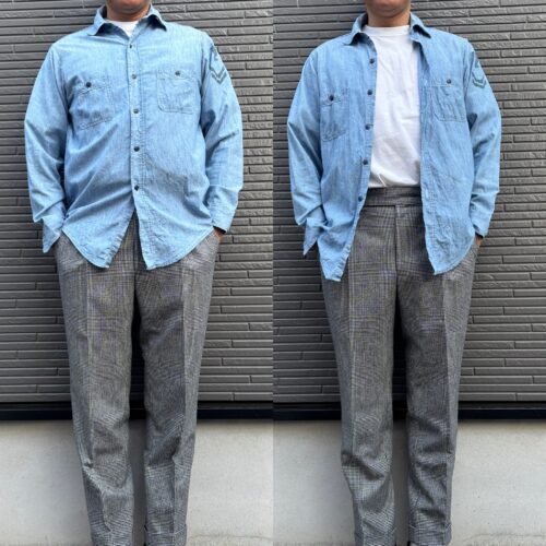 実はサイドにマチが付く40〜50sのシャンブレーシャツは襟の角度が狭くシャープで、着丈が長いのが特徴。よってトップスとしてタックアウトで着る際に着丈が長すぎるので、パンツとのバランスを取るのが難しいです。