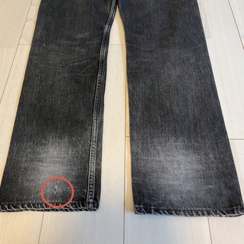 状態は左足の裾近くに横糸だけになった箇所(画像3枚目の赤丸)がありますが、それ以外に気になる汚れや穴等はございません。ただし画像の通り両足の背面裾付近が色落ちしていますが、背面で自分では見えないのでそこまで気にならないかと思います。
