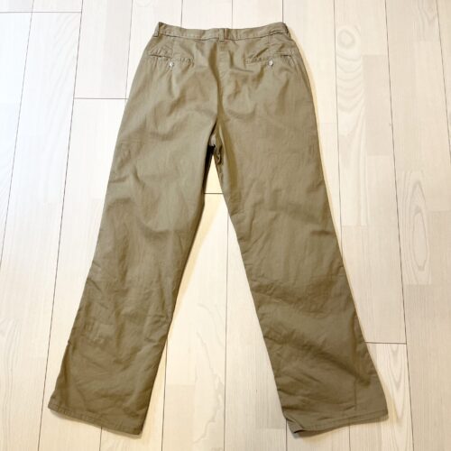 サイズは日本人にゴールデンなW32L32で、実寸は以下に記載したのでご確認ください。カラーは何にでも合わせやすい濃い目のベージュで、デニムジャケットはもちろんセージグリーンのバブアーに合わせても大人っぽく纏まります。