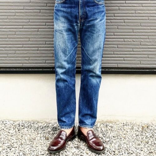 リーバイス505は501に比べて膝下がテーパードしているので、レングスはノークッション〜ハーフクッションで合わせるとシルエットが綺麗に出ます。また505に合わせる靴はボリューム感の少ないローファー系の革靴で間違いないでしょう!