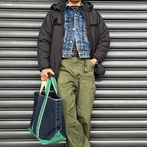 続いての商品は、昨年末の北陸古着屋巡りで富山の名店BURMA-SHAVEで購入した80〜90sの耳付き(ブルーのガイドラインのこと)トートバッグです。今まで10年くらい古着屋巡りしてきましたが、このタイプのトートバッグを見たのは初めてです!